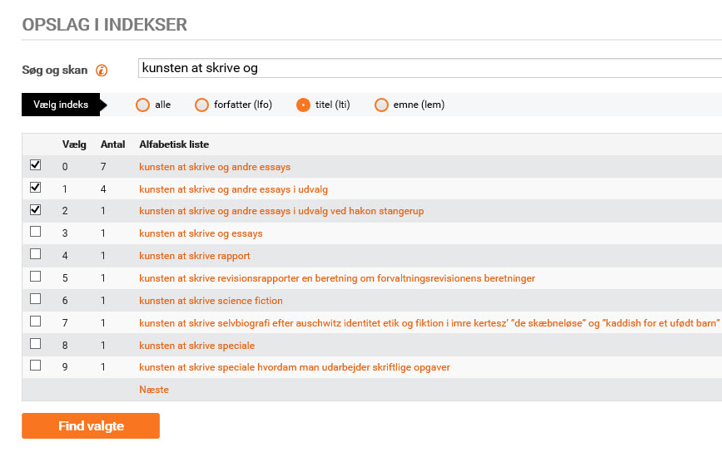 Eksempel: 1) Start med at skanne i hovedtitel, 2) vælg det, du vil finde, og 3) klik på Find valgte 4) afgræns på søgesiden Alle materialer vha. filtre:
