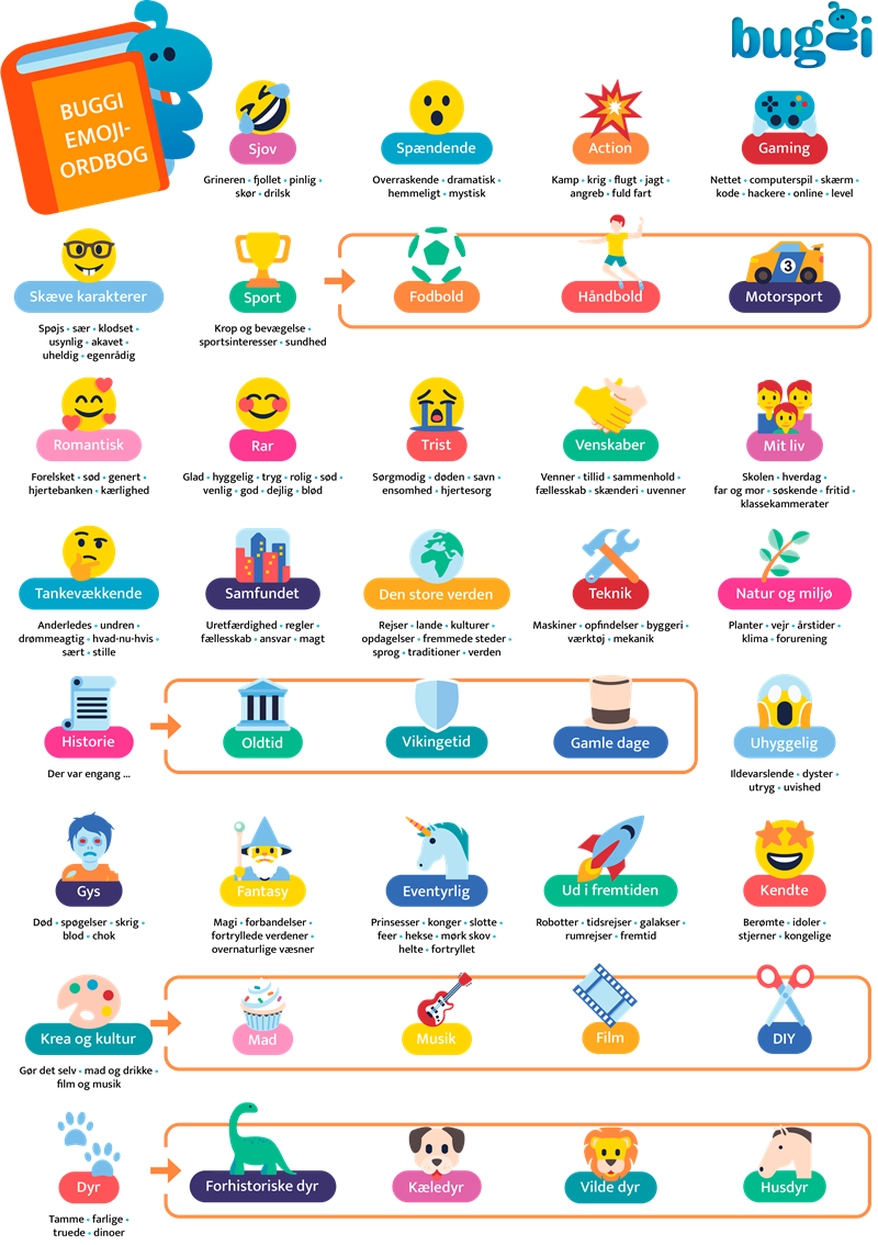 Bag hver emoji gemmer sig en klynge af ord, som de, der tagger titler til Buggi, bruger som pejlemærker, når de ”beskriver” en bog med emojier. De forskellige emojier er udvalgt af mere end 200 børn som har kigget på ordklyngerne og valgt den emoji, de synes passer bedst til.